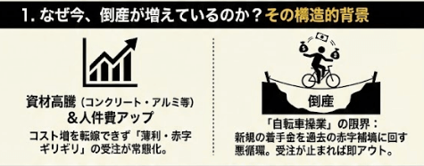 これが、資金力のない業者を直撃しています。 契約が取れず、売上が立たない。しかし、資材費や人件費の支払いは待ってくれない。 こうして、自転車操業だった業者が、今、軒並み潰れているのです。