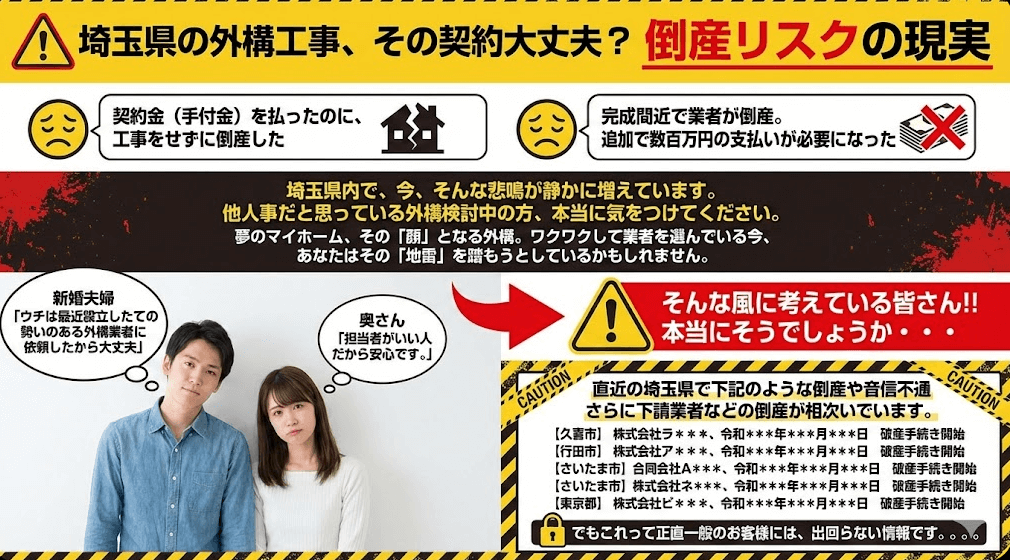 直近の埼玉県で下記のような倒産や音信不通さらに下請業者などの倒産が相次いでいます。